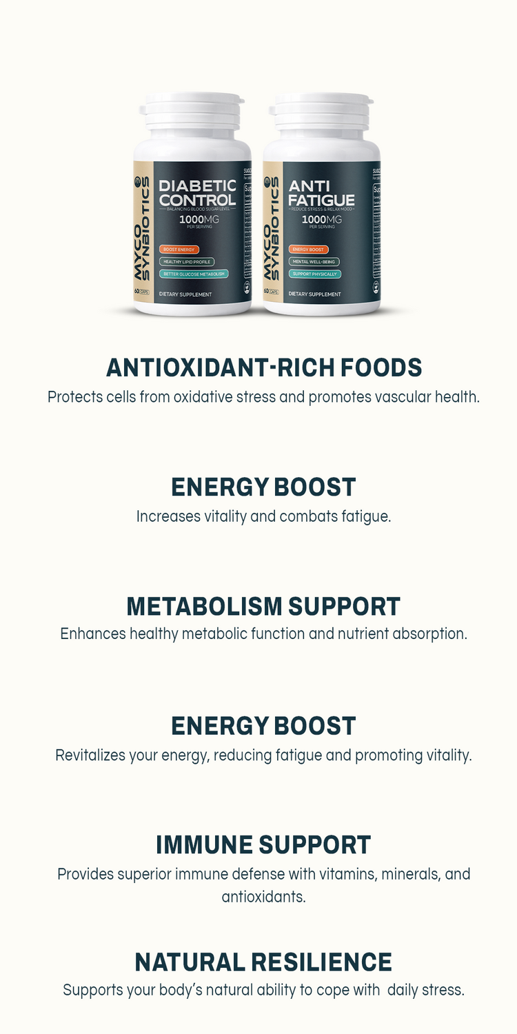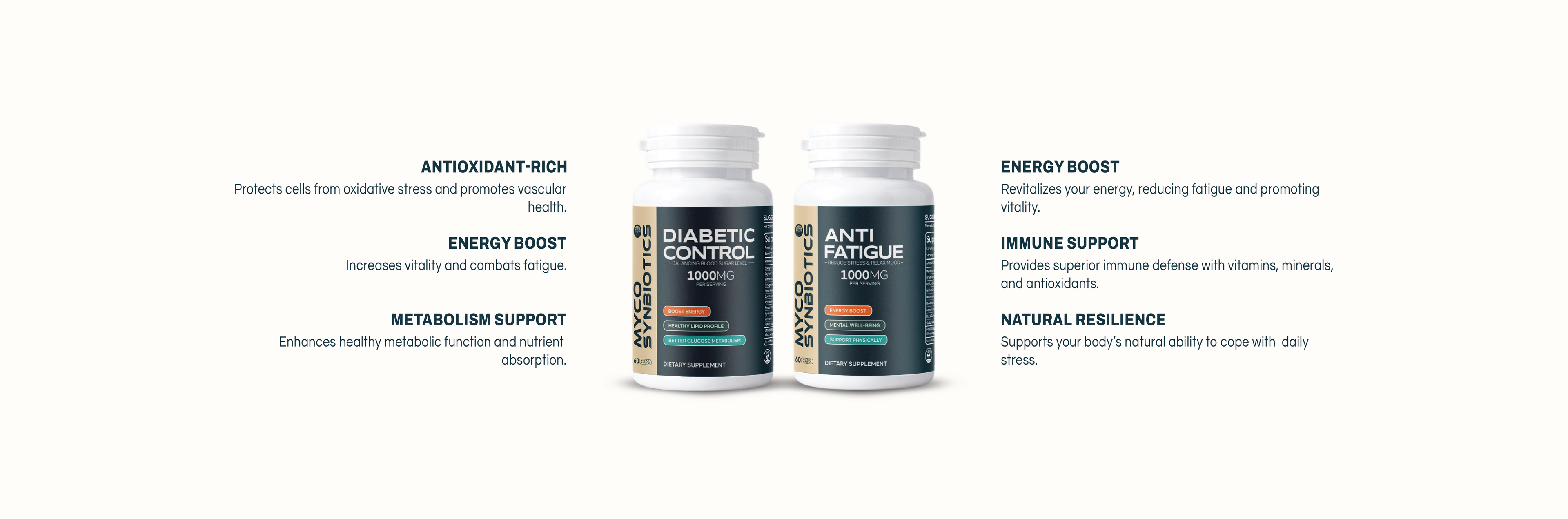 This premium wellness bundle includes two powerful supplements: one for diabetic support and one for combating fatigue. Together, they promote balanced blood sugar, sustained energy, and improved mental clarity using a blend of medicinal mushrooms, herbs, and essential nutrients.