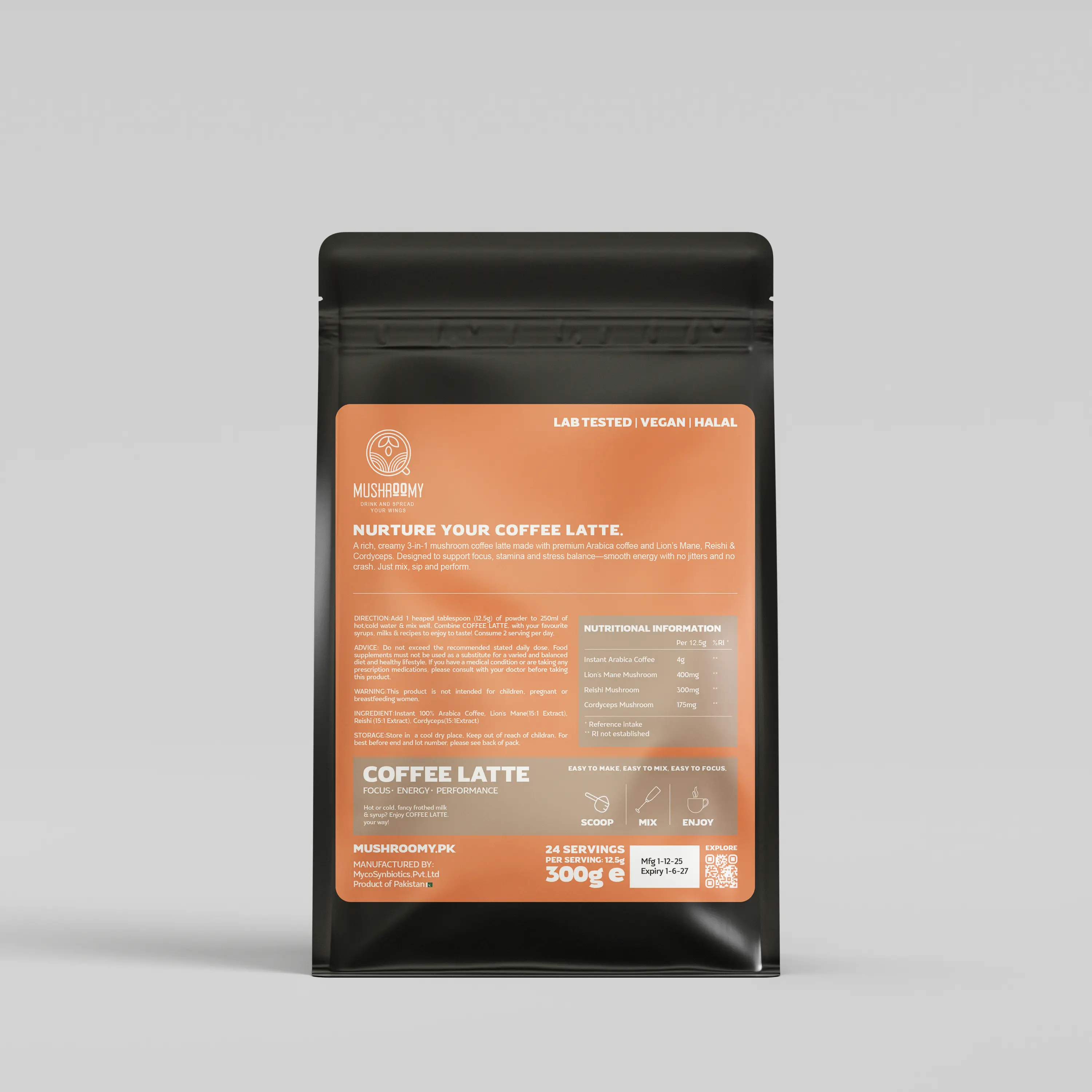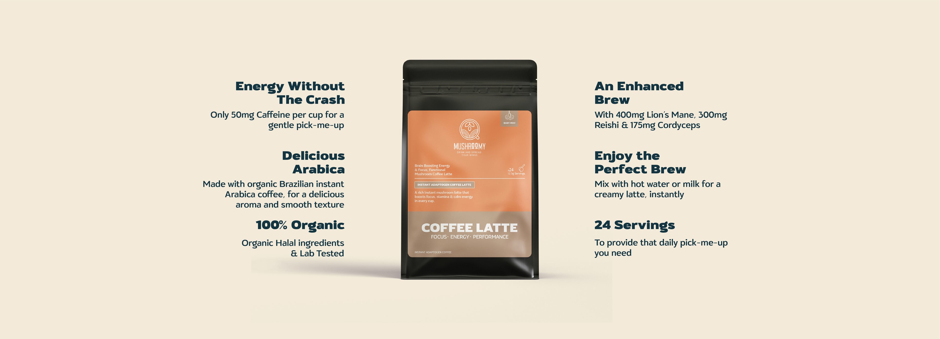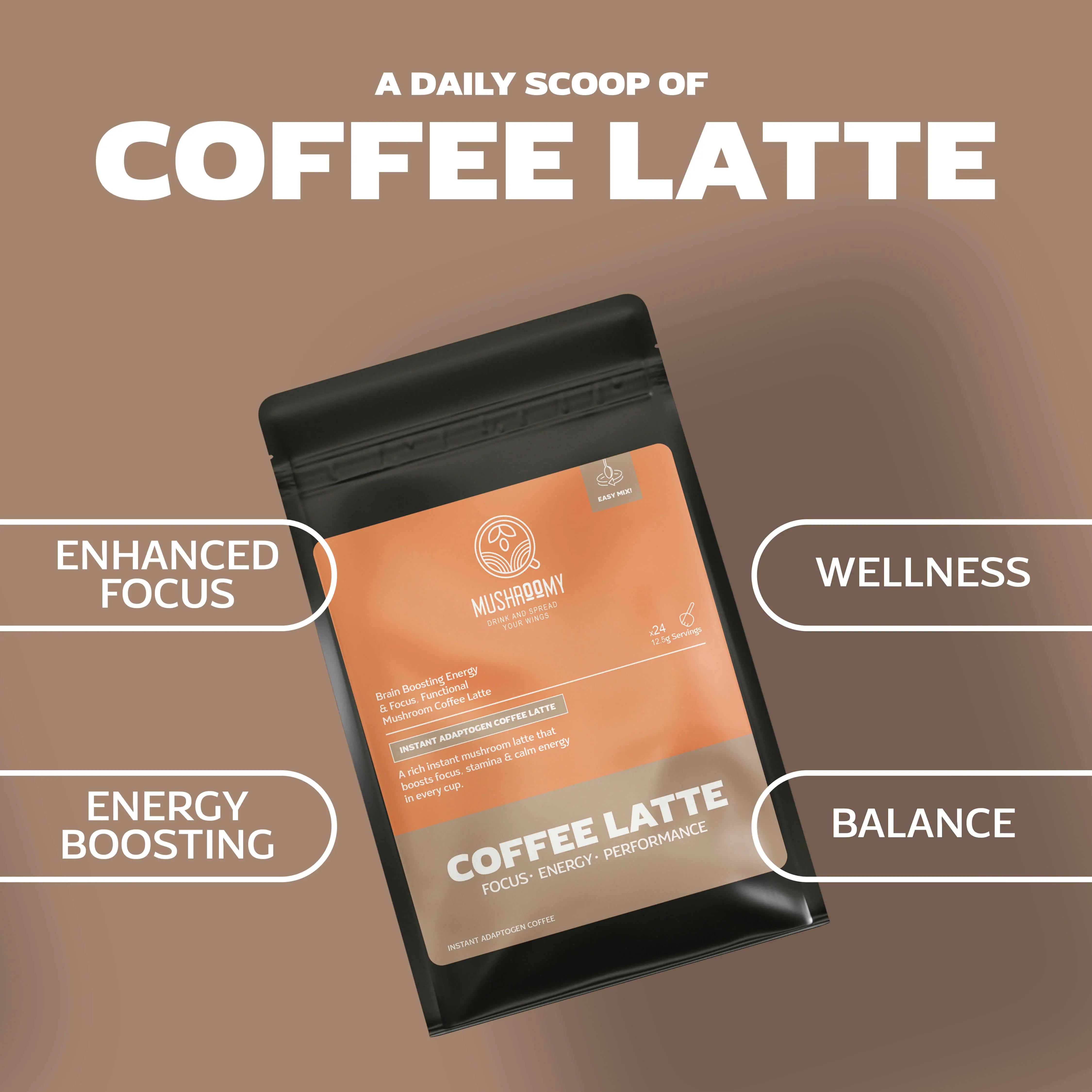 A rich, creamy 3-in-1 mushroom coffee latte made with premium Arabica coffee and Lion’s Mane, Reishi & Cordyceps. Designed to support focus, stamina and stress balance—smooth energy with no jitters and no crash. Just mix, sip and perform.