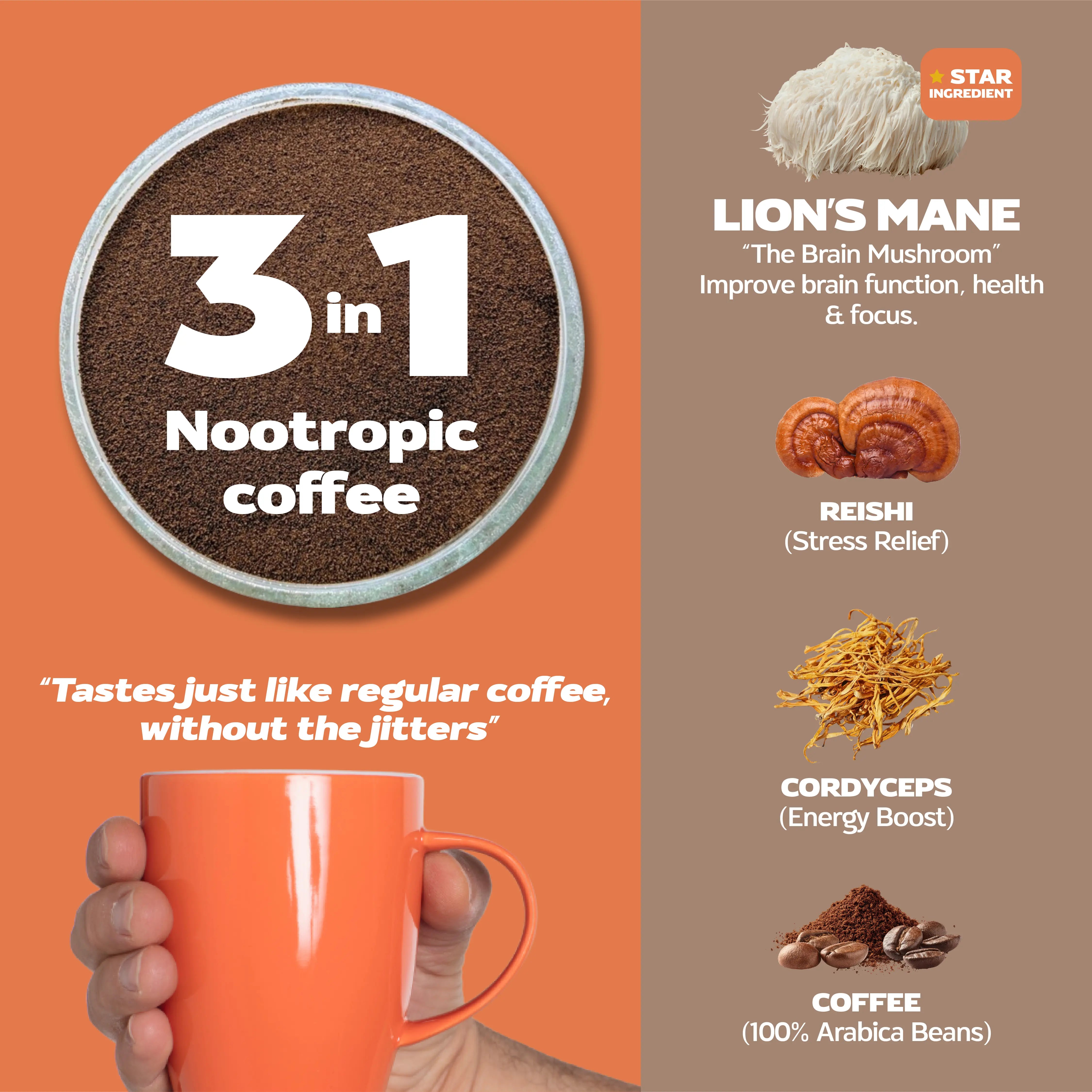 Most users experience calm, steady energy rather than jitters, as Reishi and Cordyceps help regulate the body’s stress response to caffeine.