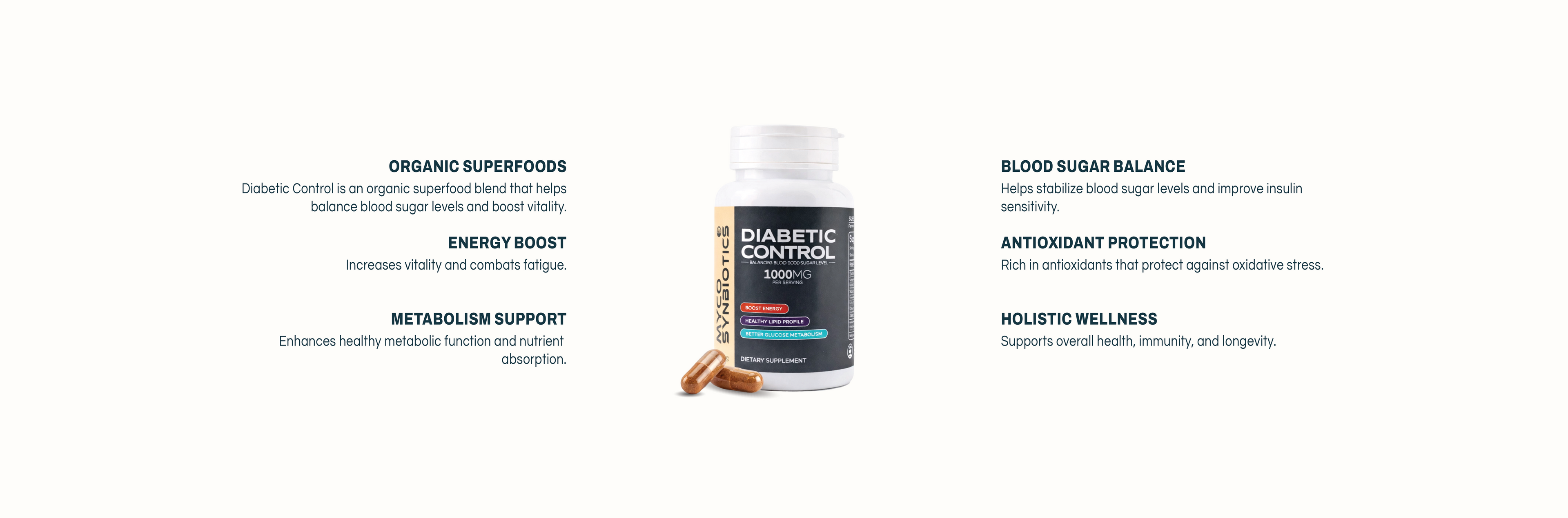 Myco Synbiotics Diabetic Control Formula supports pancreatic health, regulates blood sugar level, and mimics insulin action. It improves insulin sensitivity, enhances glucose uptake, and stabilizes blood sugar, making it an ideal for prediabetes and diabetes.