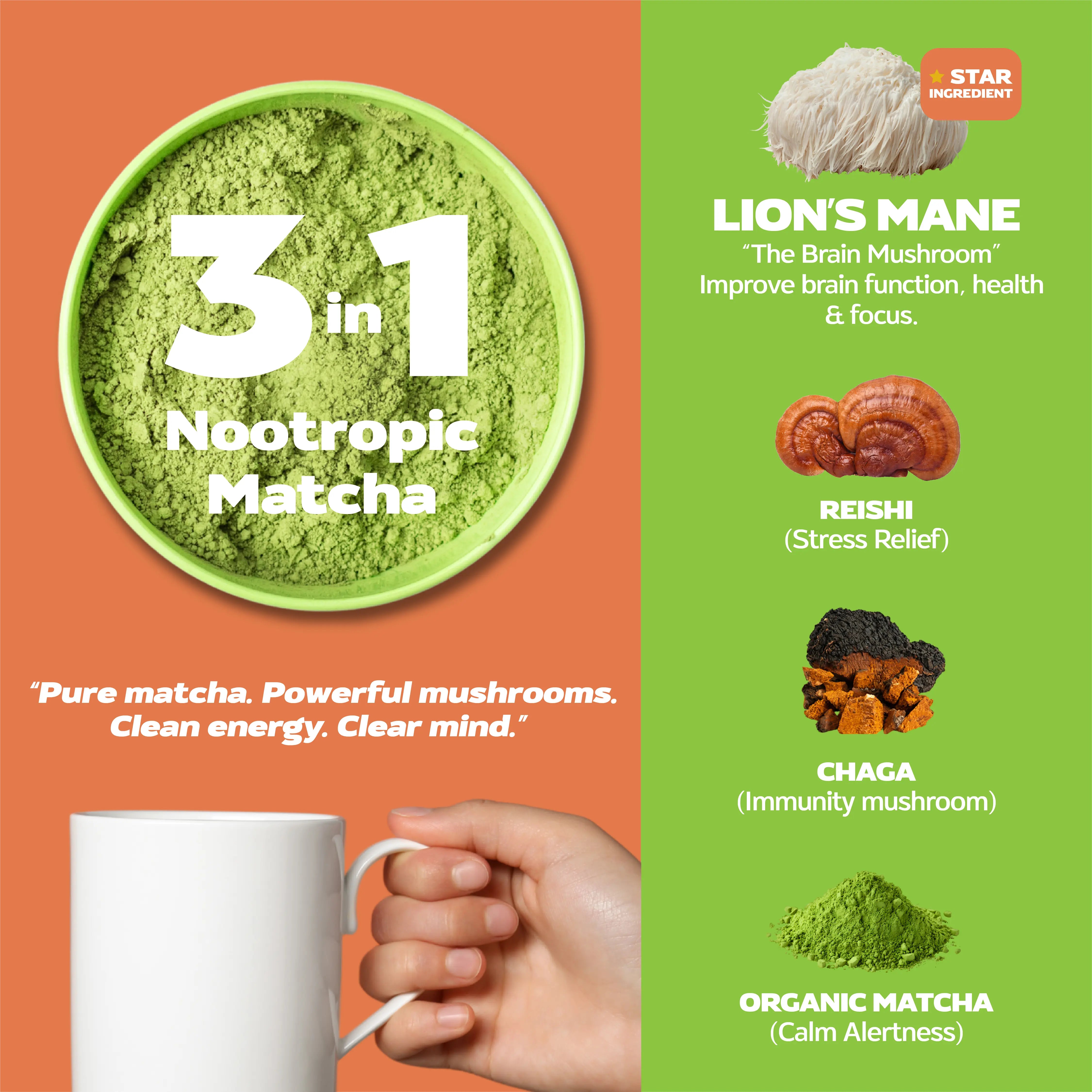 Organic Matcha, Lion’s Mane(15:1 Extract), Reishi (15:1