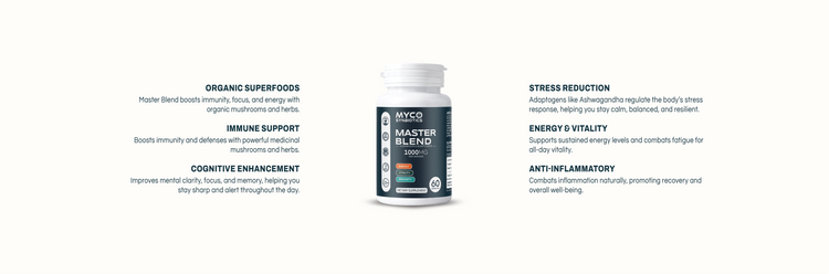 Master Blend Capsules provide comprehensive support for immunity, cognitive function, stress management, and overall vitality. The blend of powerful mushrooms and herbs promotes mental clarity, boosts energy levels, reduces inflammation, and strengthens the immune system.