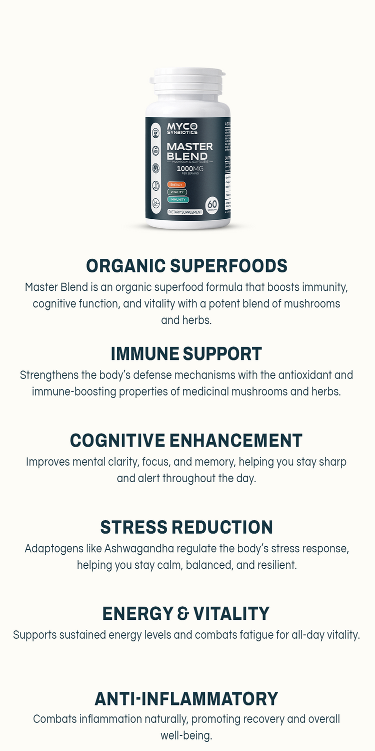 Experience peak wellness with Master Blend — a scientifically crafted formula combining premium mushrooms and adaptogenic herbs. This powerhouse blend supports cognitive function, immunity, stress resilience, and overall vitality. With active compounds like beta-glucans and adaptogens, it enhances your body’s natural defenses and promotes optimal