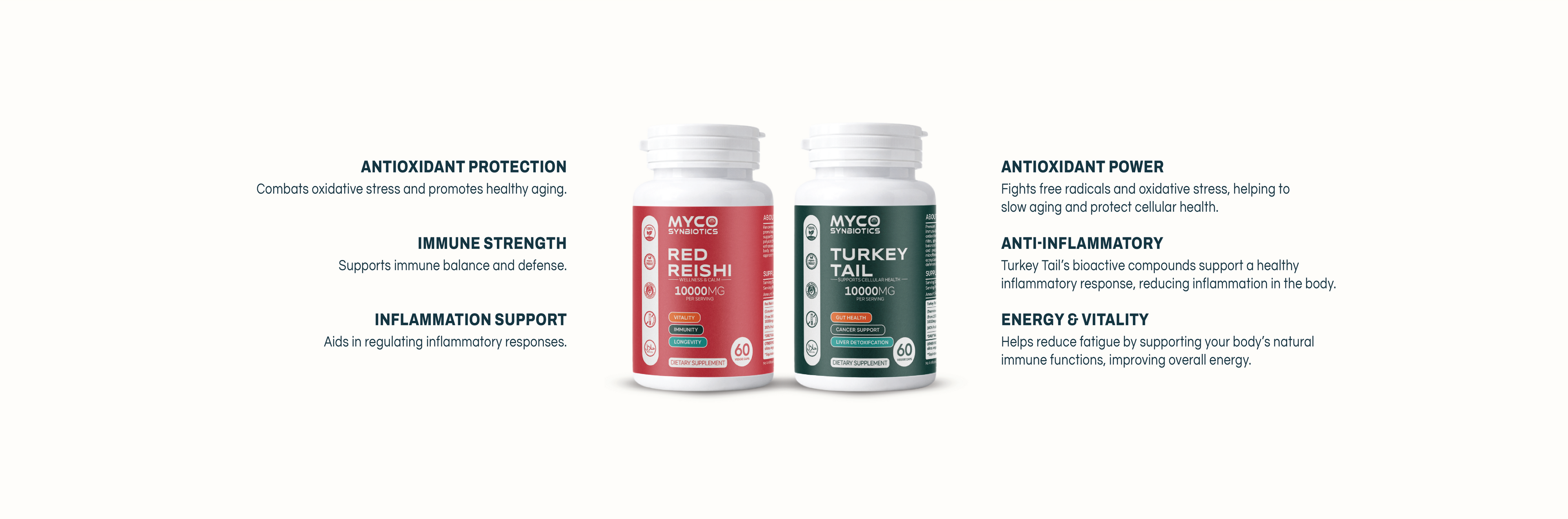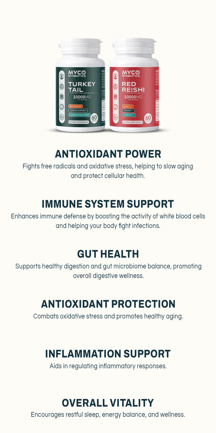 Red Reishi modulates immune response and reduces stress, while Turkey Tail boosts immune function and promotes a balanced gut microbiome.