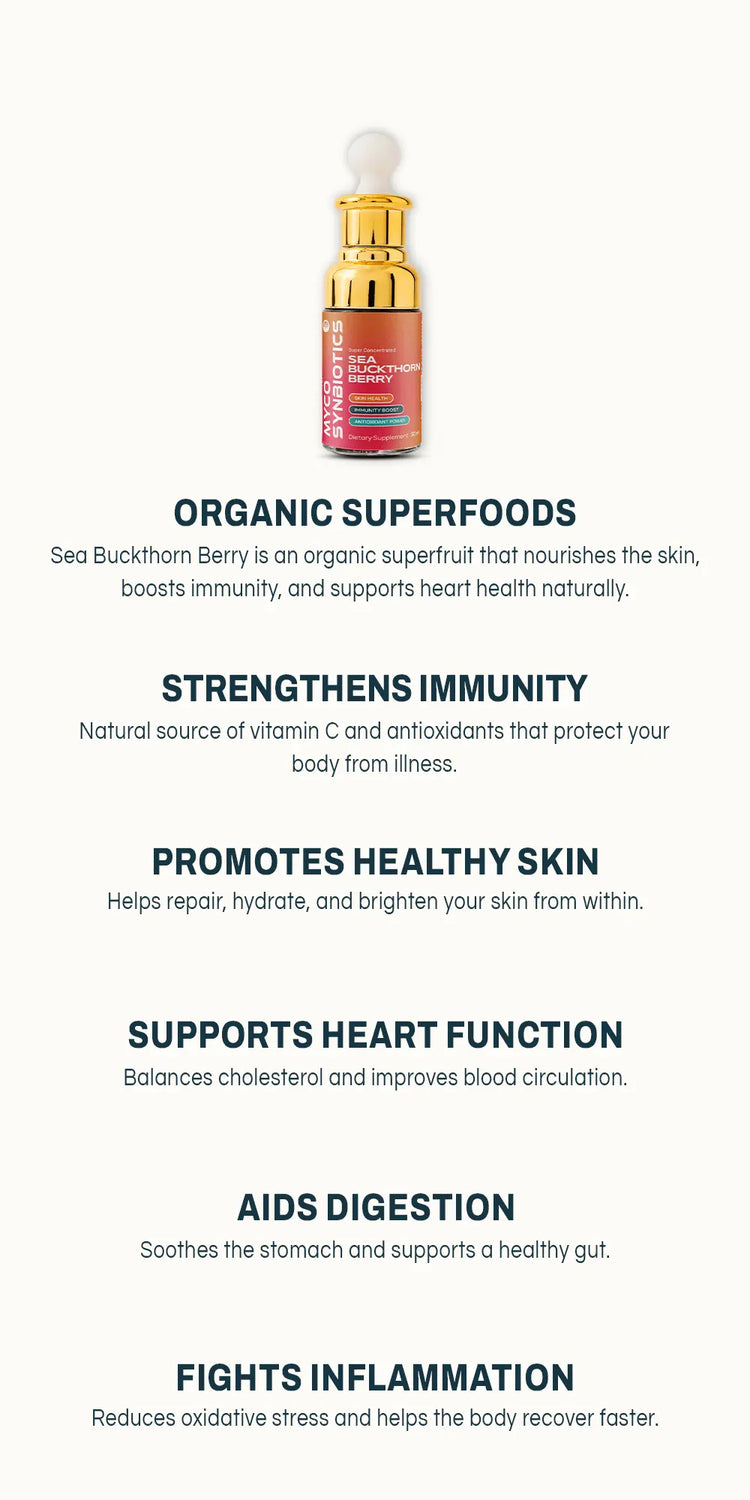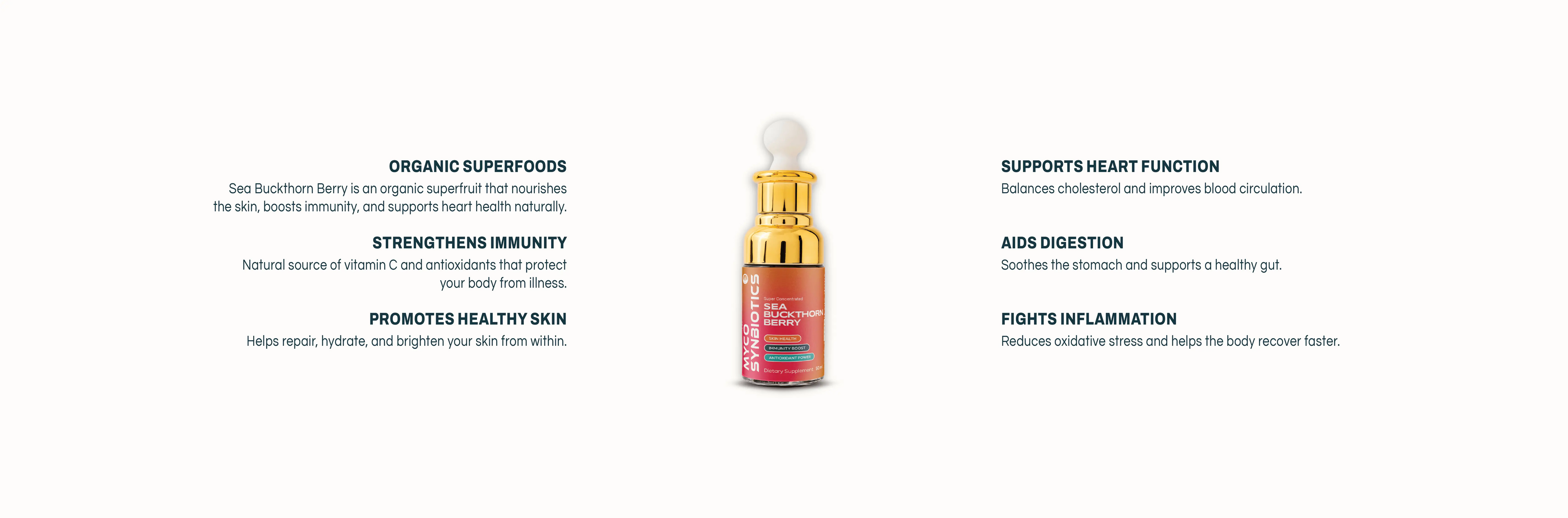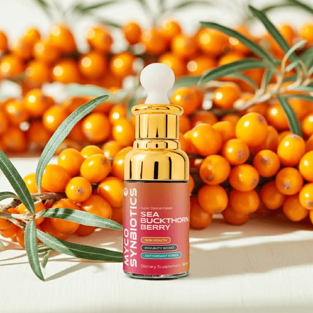 It’s a concentrated herbal extract made from Sea Buckthorn berries, known for their vitamins, antioxidants, and omega oils.