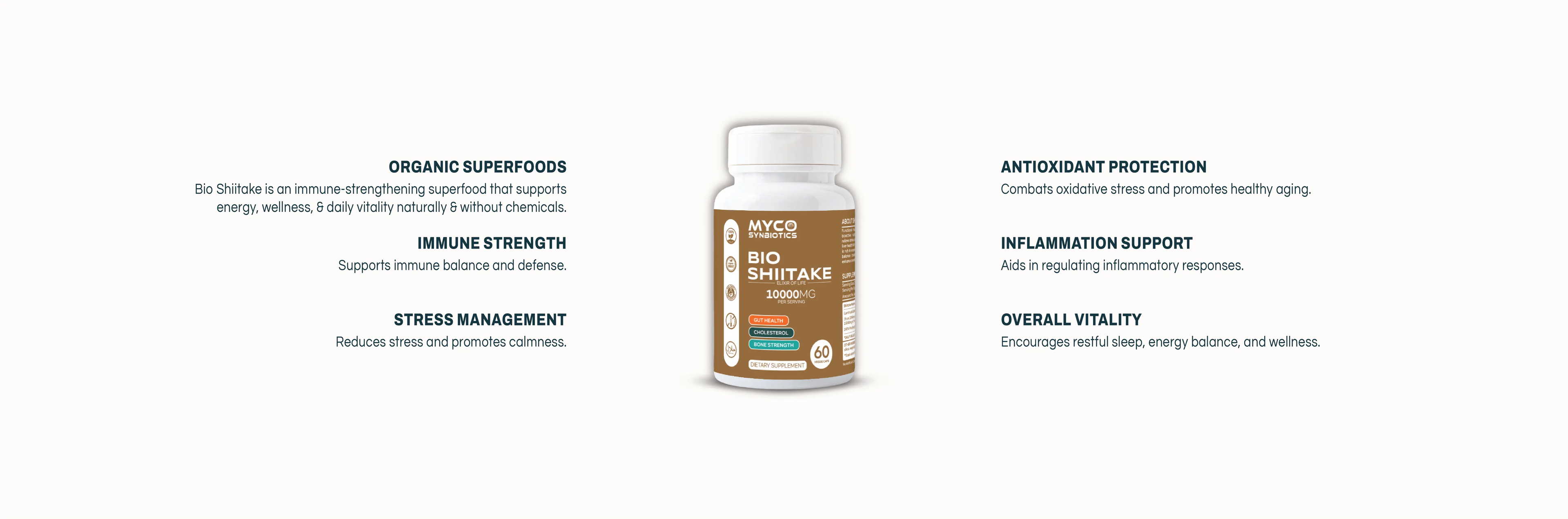 Functional mushrooms are packed with potent bioactive nutrients that strengthen immunity, relieve stress, and promote optimal heart, gut, and iver health. Renowned as the “Elixir of Life,” Shiitake is rich in essential vitamins and minerals that help balance cholesterol, combat inflammation, and enhance overall vitality.
