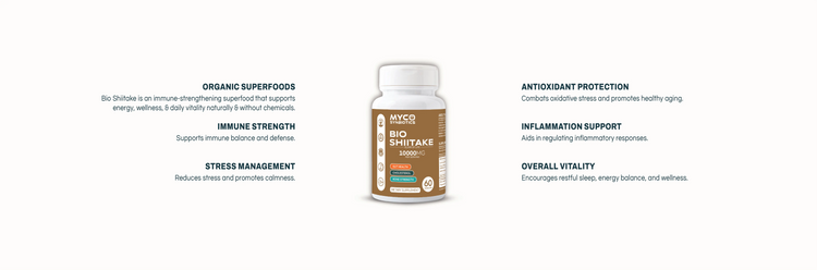 These are organic shiitake mushroom extract capsules designed to support immunity, energy, and overall wellness.