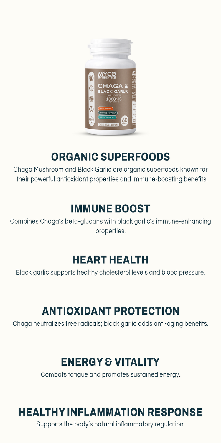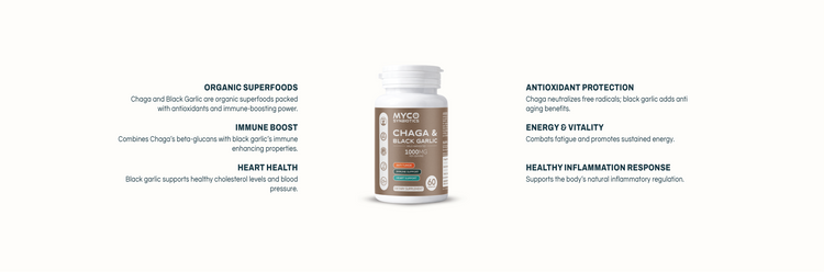 Chaga boosts energy through immune support, while black garlic improves circulation and overall vitality.